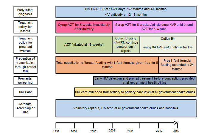 PMTCT programme became the country’s key program where screening among antenatal mother was implemented country wide in 1998. Aiming at preventing vertical transmission, all HIV positive mothers were given free ARV and HIV-exposed infants given ARV prophylaxis. To further interrupt vertical transmission, HIV-exposed infants were also given free replacement feeding up to 2 years of age. Beginning 2011 the government adopted treatment option B+ for HIV infected mothers. The timeline of PMTCT implementation is depicted in the figure below.